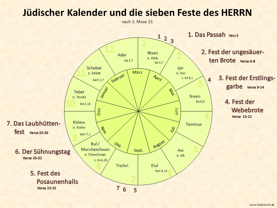 So wie es einen christlichen Kalender oder das Kirchenjahr gibt, das mit der Adventszeit Ende November beginnt, stellt uns Levitikus 23 den religiösen Kalender Israels vor, der im Frühjahr anfängt. Der Sabbath als Ruhe- und Erholungstag steht als Geschenk Gottes über allen diesen Festen und strukturiert sie. Er ist eine grundlegende Einrichtung und in Gottes vorbildhafter Ruhe nach dem sechstägigen Schöpfungsakt in Genesis 2,1+2 begründet. Zugleich ist er das vierte Gebot und wird in den restlichen vier Büchern des Pentateuchs (fünf Bücher Mose) weiter erwähnt. An diesem Tag fanden auch besondere Opfer statt.